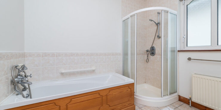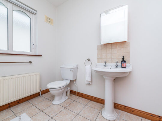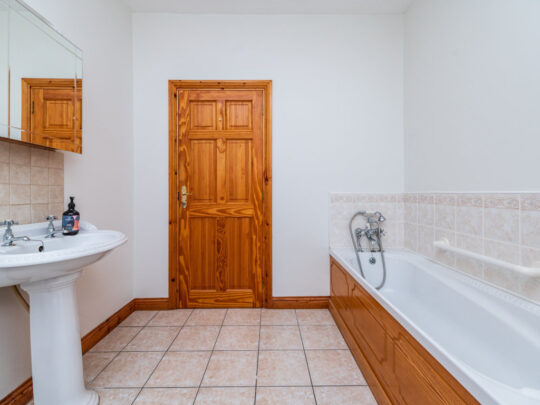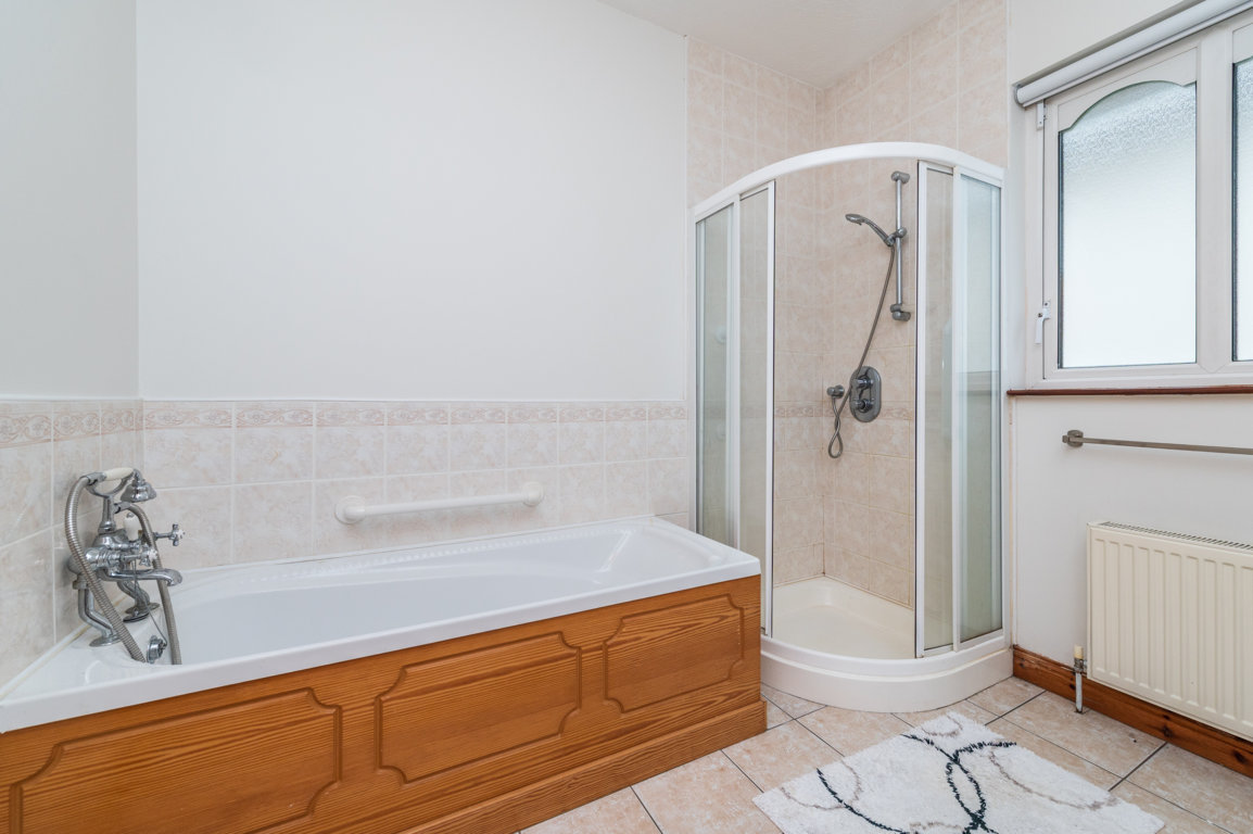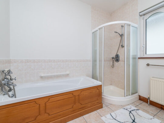Bathroom: 2.8m x 2.45 Partially tiled walls, tiled floor, pedestal w.h.b. with tiles & mirror over, w.c. and bath with telephone shower, separate fully tiled corner shower with mains shower and window