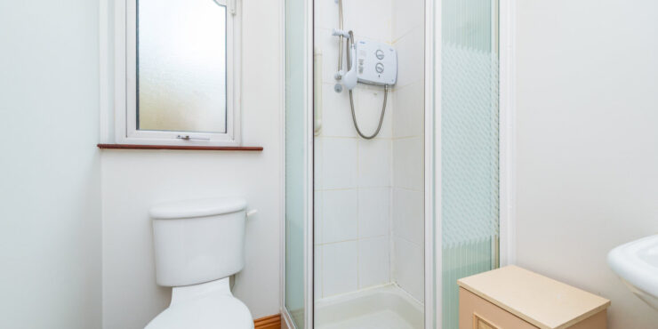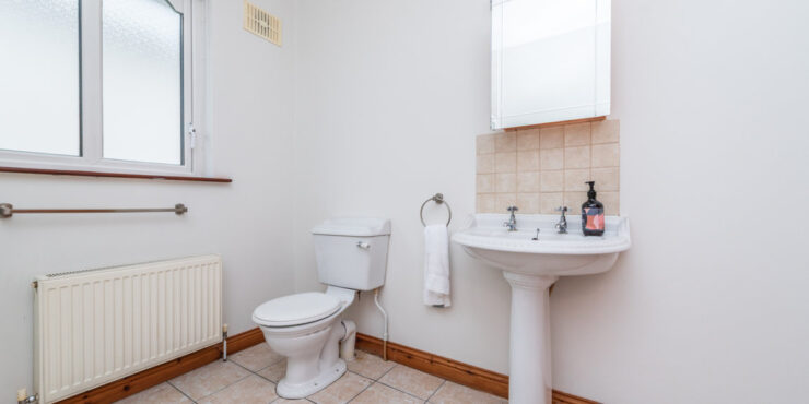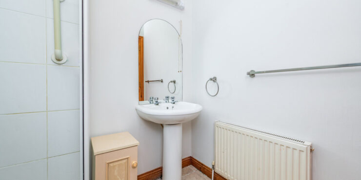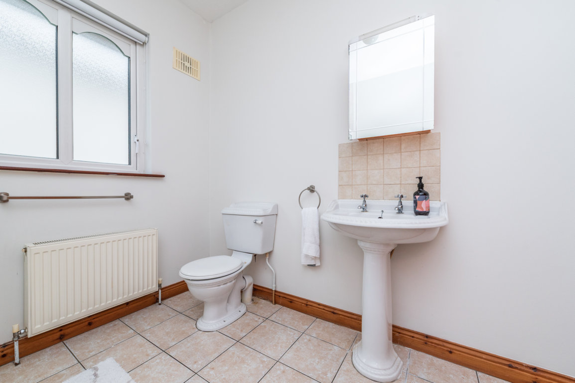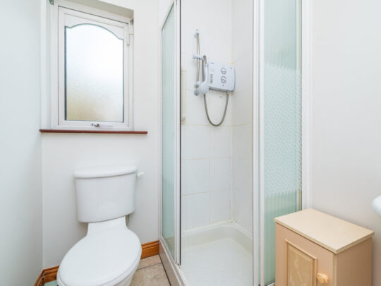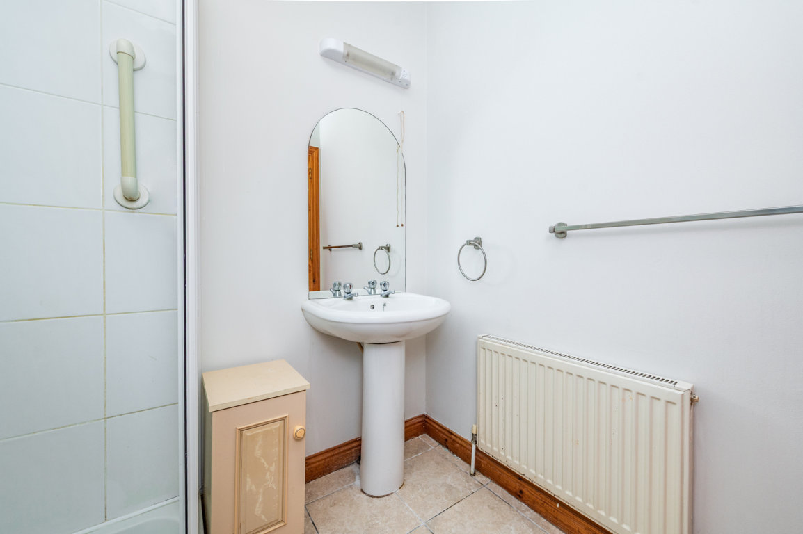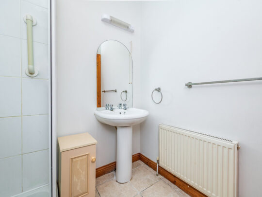 En-suite: 1.9m x 1.65m tiled floor, step-in, fully enclosed shower with electric Triton shower fully tiled, pedestal w.h.b. with mirror over, w.c., radiator and window