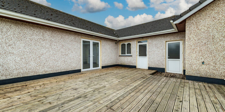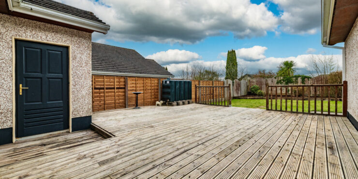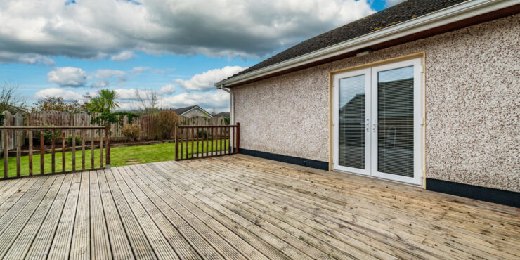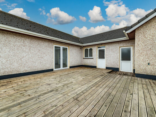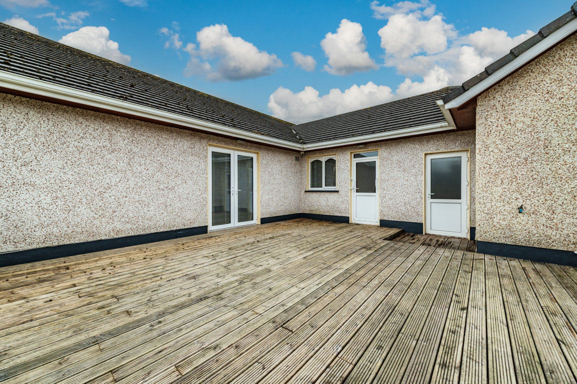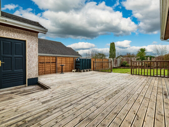 Superb exceptionally private due east facing rear garden deep with large, raised deck 7.3m x 7.2m with outside power, outside tap, Garden storage shed which houses oil burner, external Oil tank, mature fully landscaped rear garden with raised plant beds with an array of shrubbery and specimen plants, gravelled to side of house with double gates.