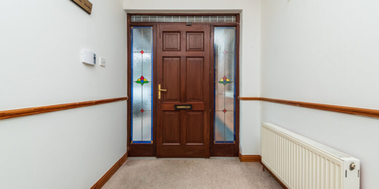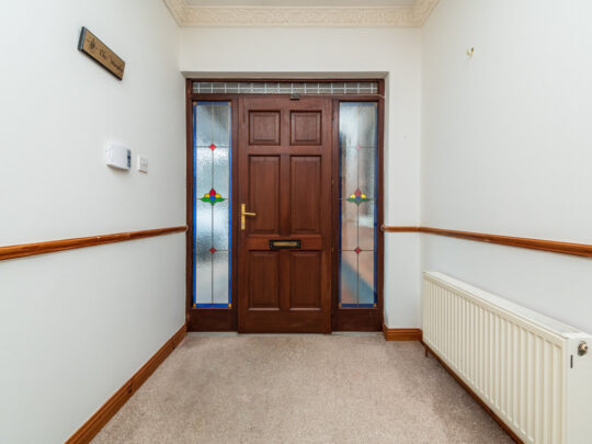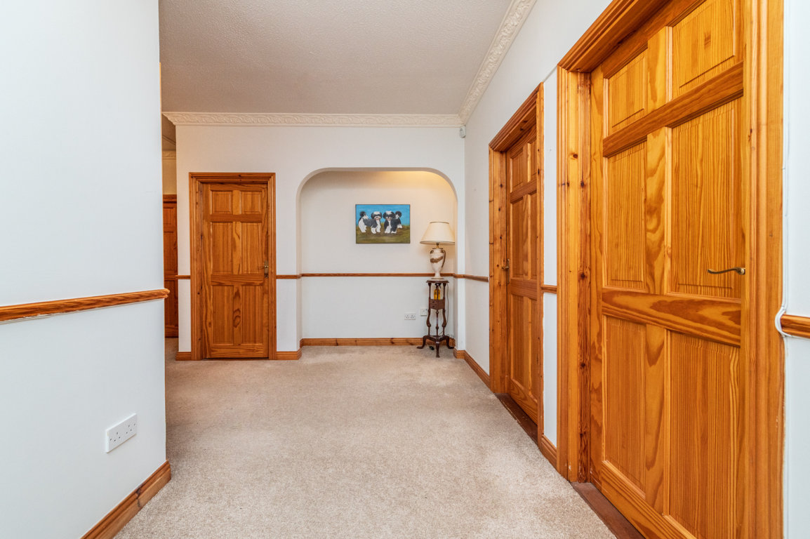 Entrance Hall: 5.5m x 2.05m carpeted flooring, ceiling coving, alarm panel