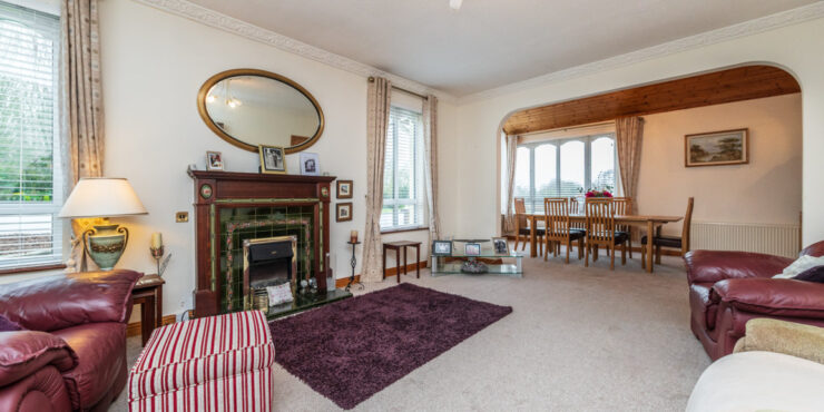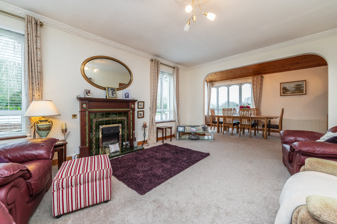Living Room: 6.05m x 4.5m carpeted flooring, ceiling coving, feature decorative solid wood mantlepiece, with tiled hearth and surround with electric fire inset, 3 x window, and arch way through to interconnecting
