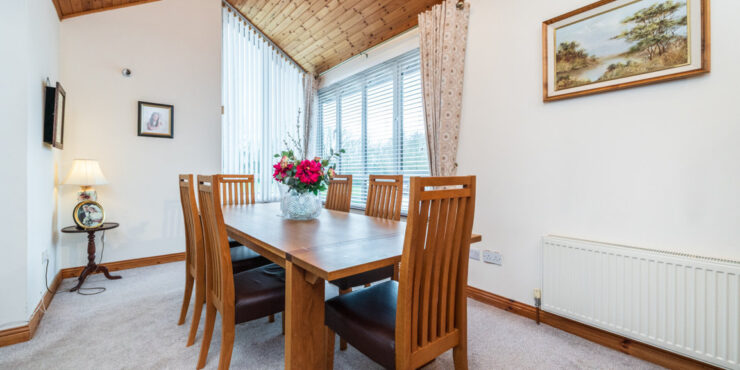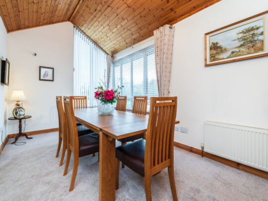 Dining Room: 5.25m x 2.85m carpeted flooring, ceiling coving, vaulted and wood panelled ceiling with 2 x corner windows