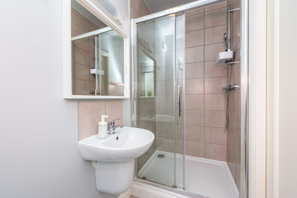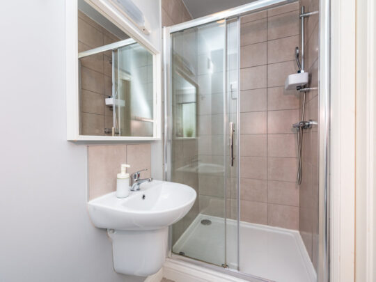 En-suite with shower, wc and whb, overhead light over vanity unit.