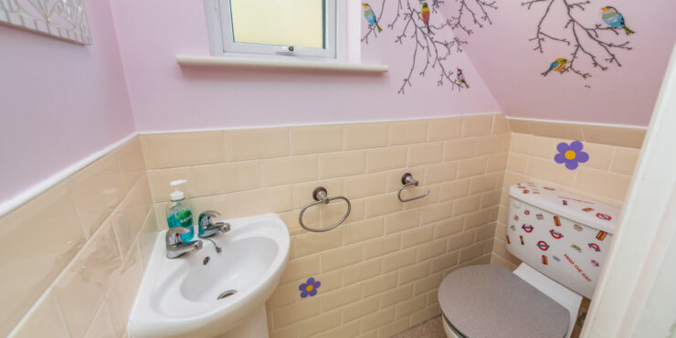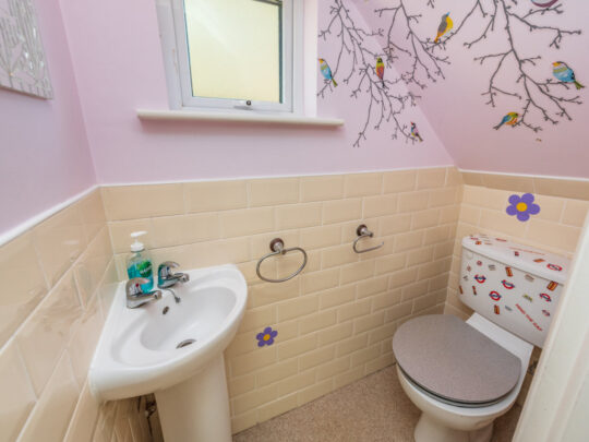 Guest W.C. with suite consisting of wc and whb , partly tiled and with window off.