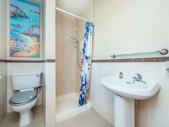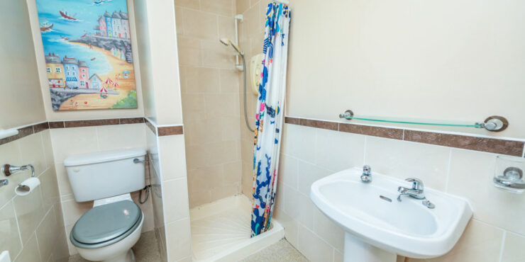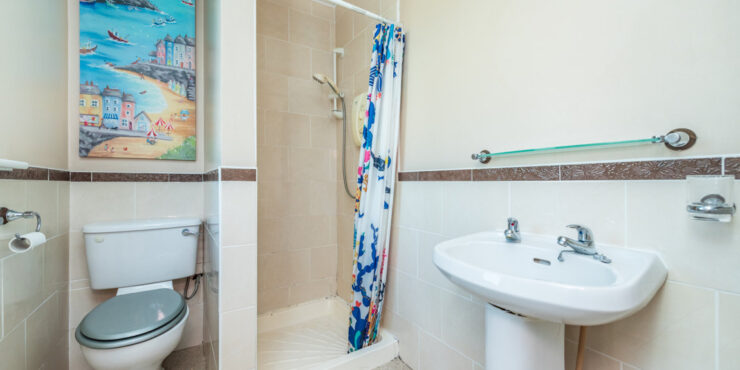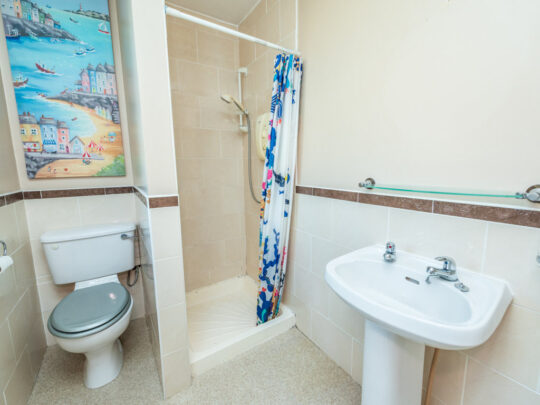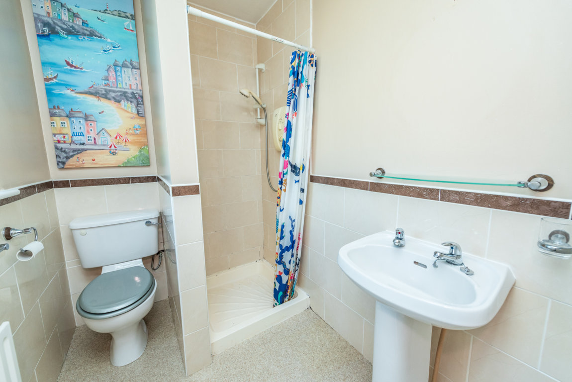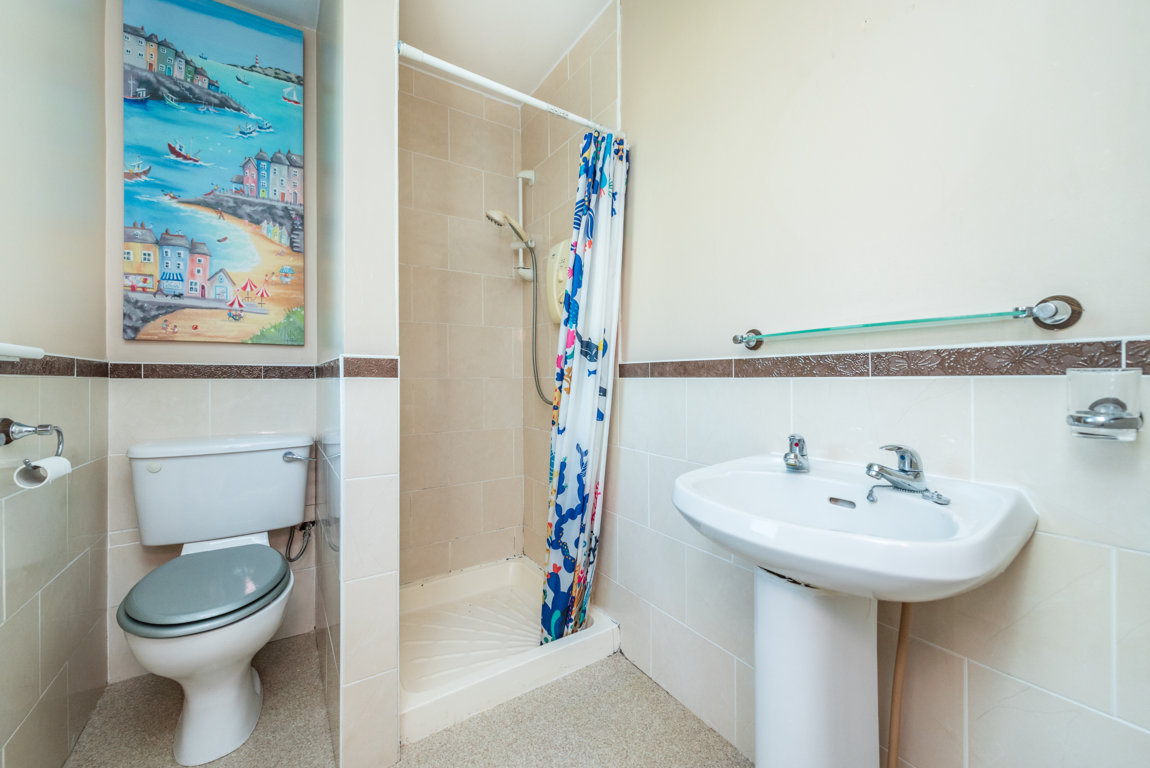 En-suite: with suite consisting of wc, whb and Mira shower. Partly tiled and with window off.