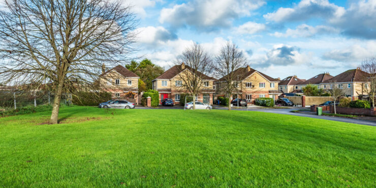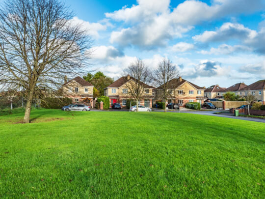 To the front: off street parking, overlooks private open green area.