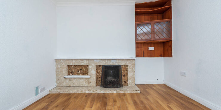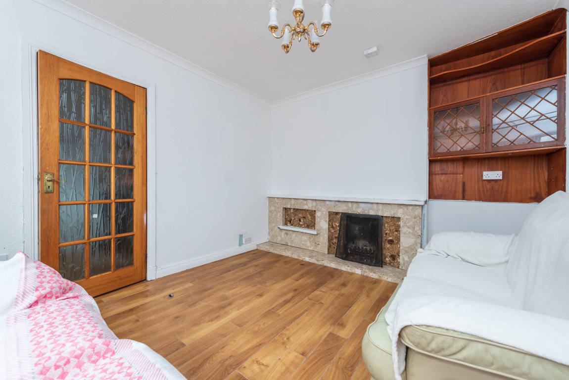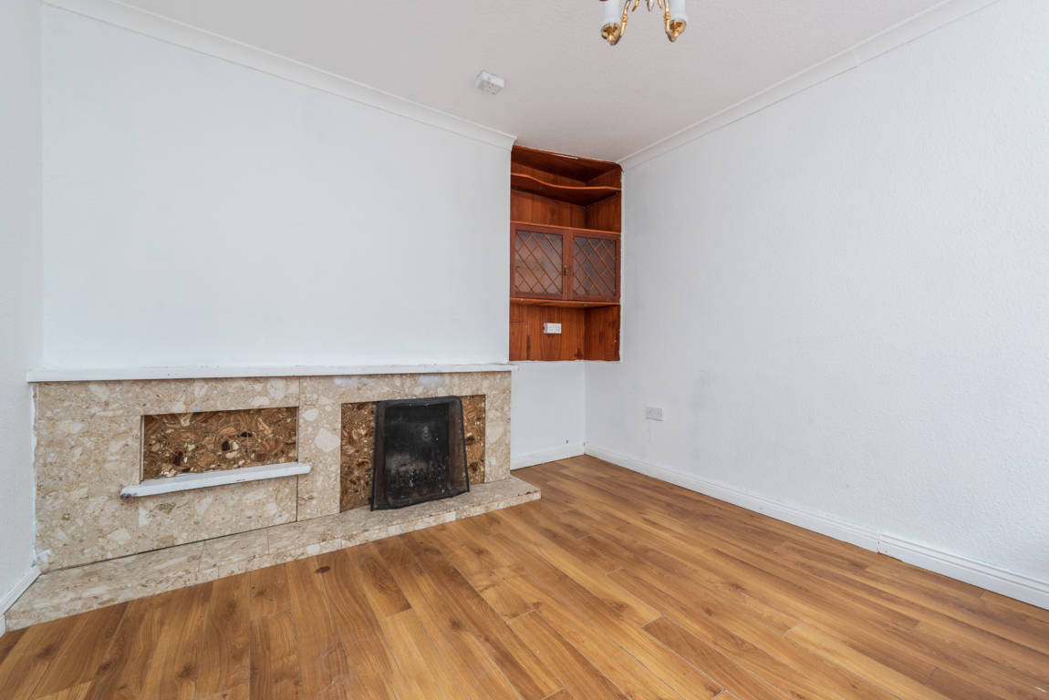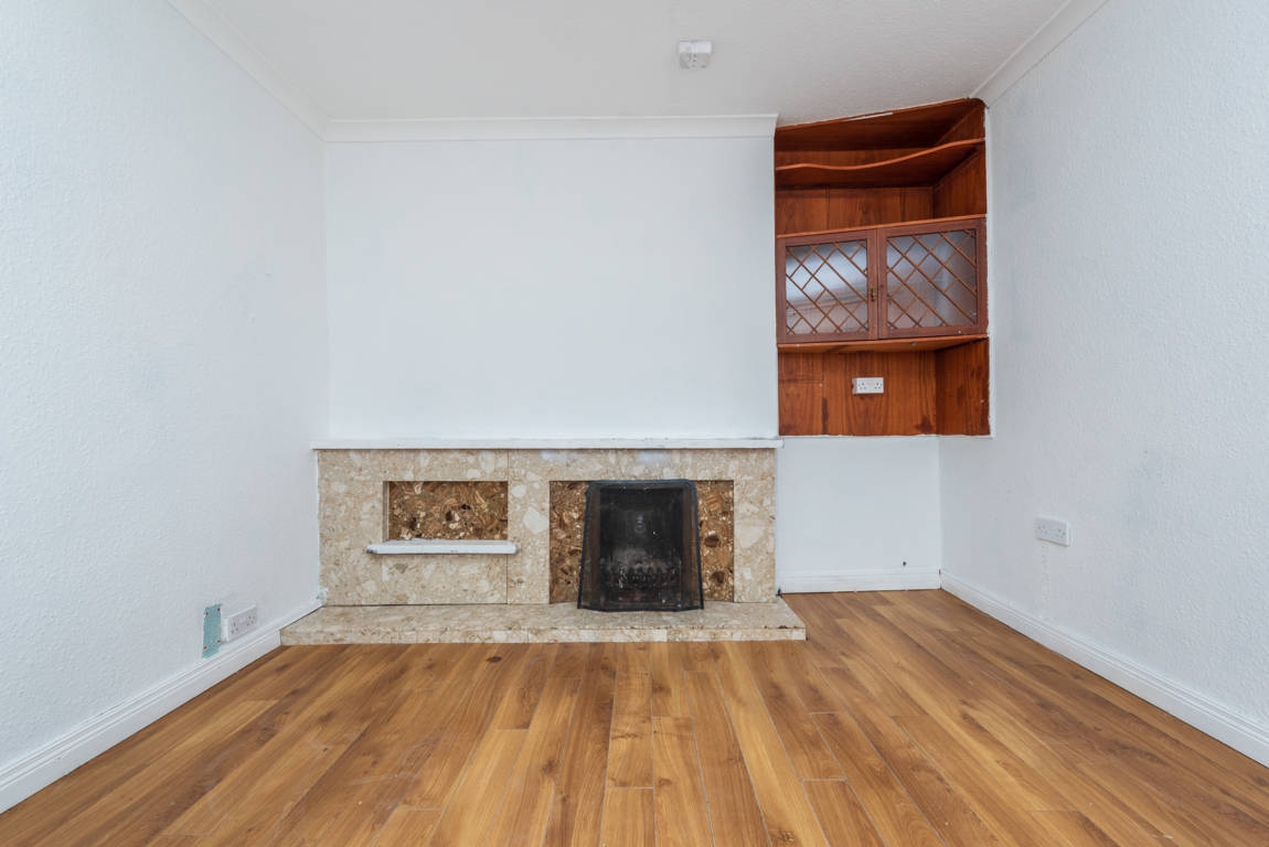 Living Room: 3.26m x 4m laminate floor, open fire with tiled hearth and mantlepiece, display cabinet.