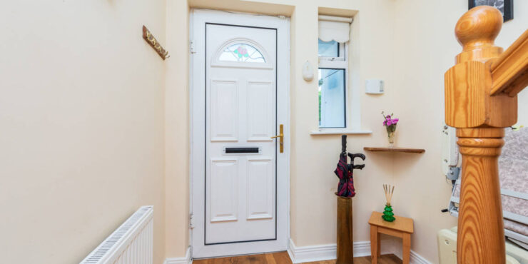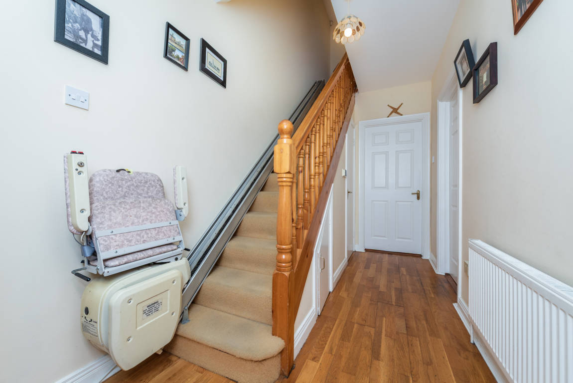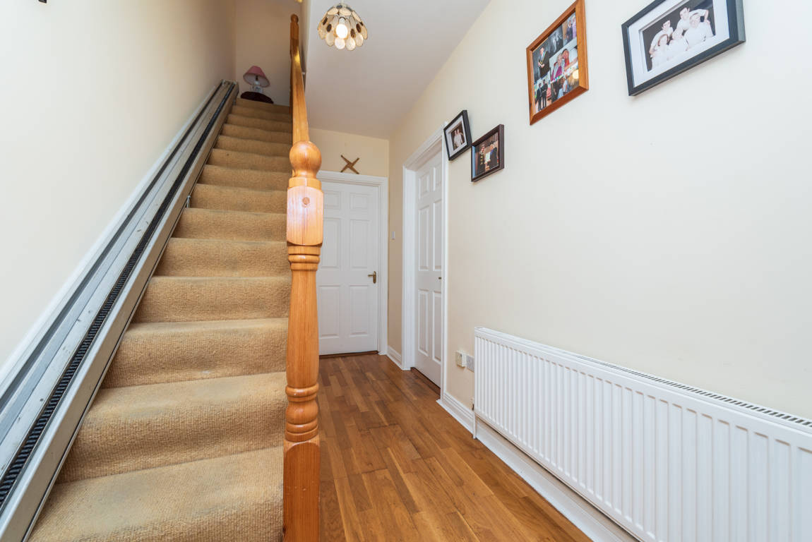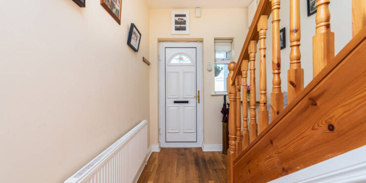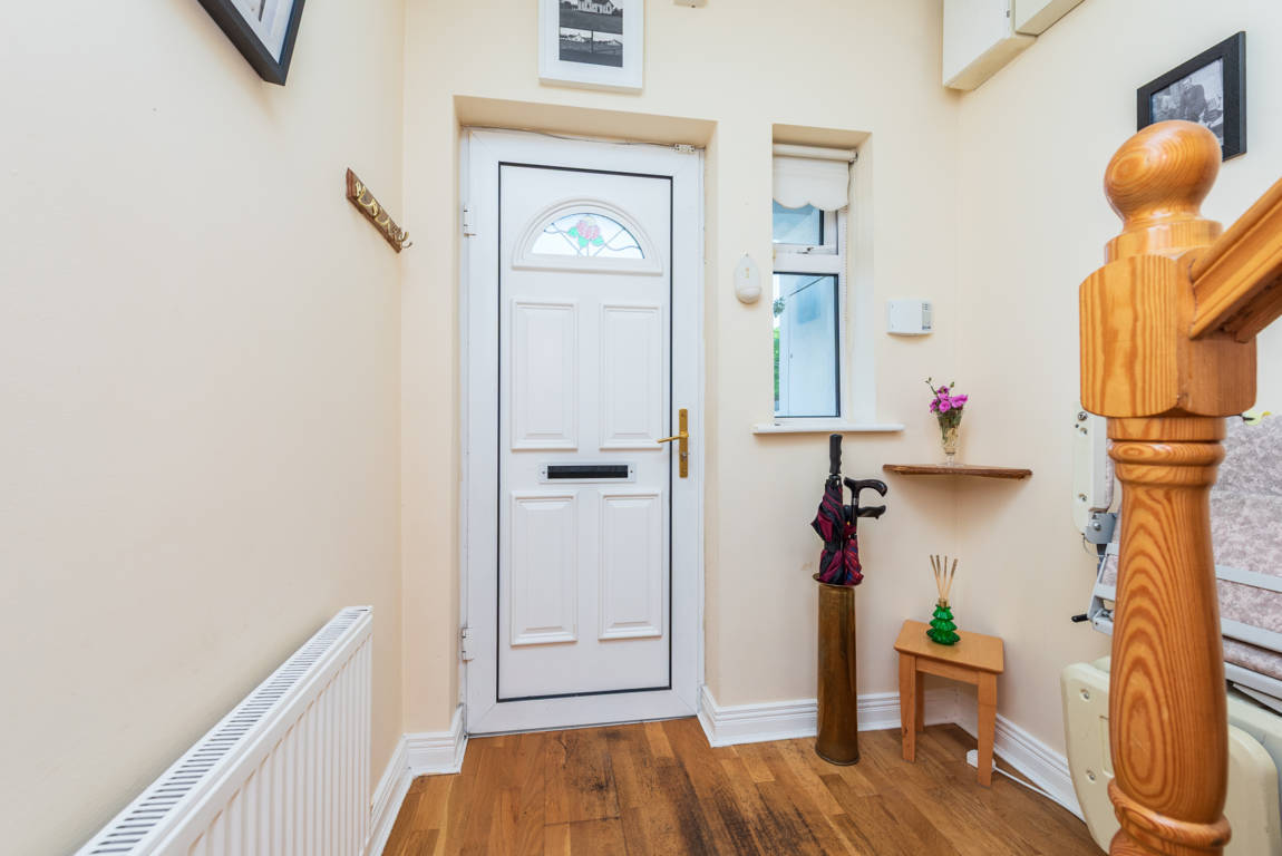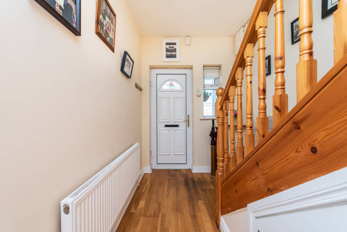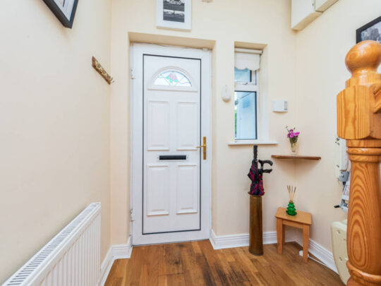 Entrance Hall: with wooden floor, alarm panel, and understairs storage area.