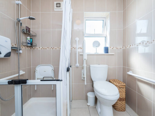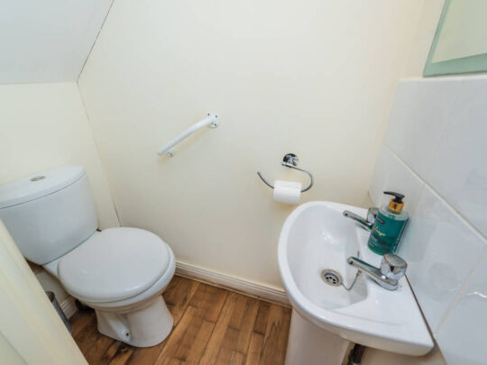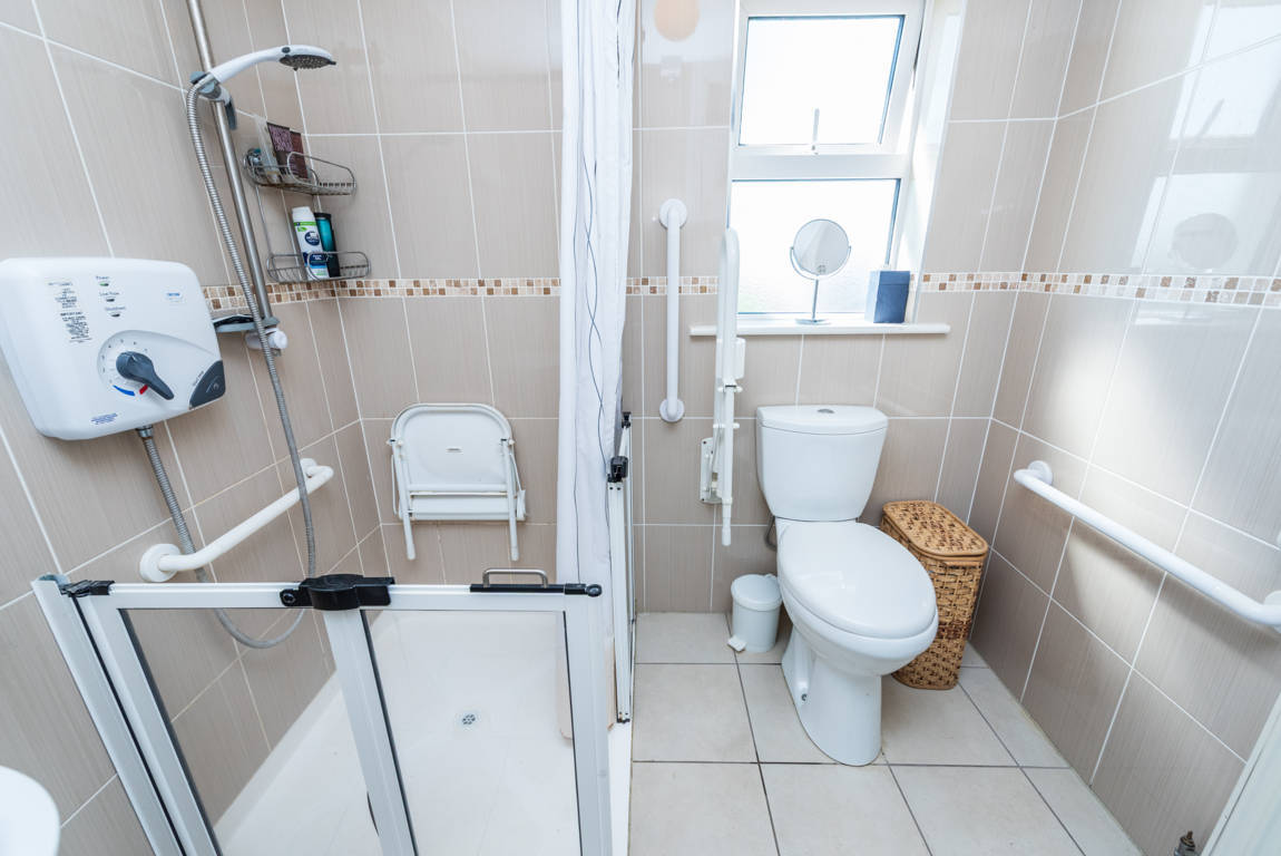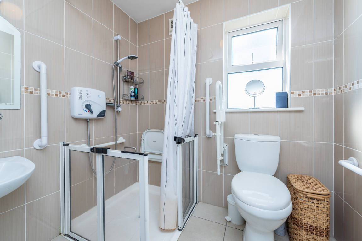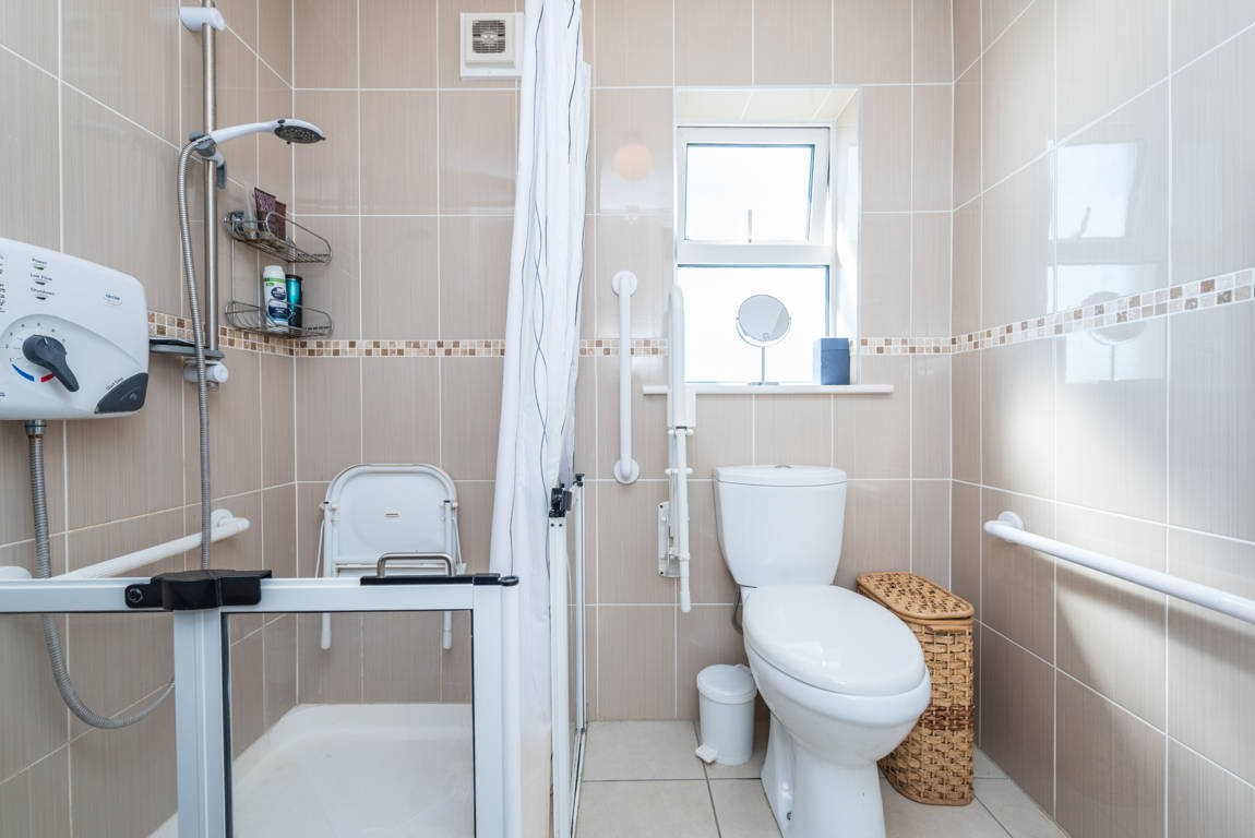 En-Suite: Fully tiled, W.C., W.H.B, and Mira shower in enclosed shower & window.