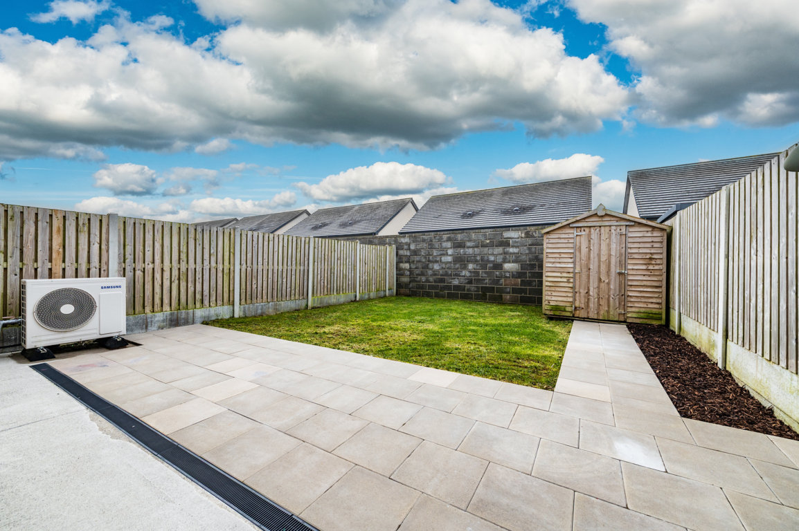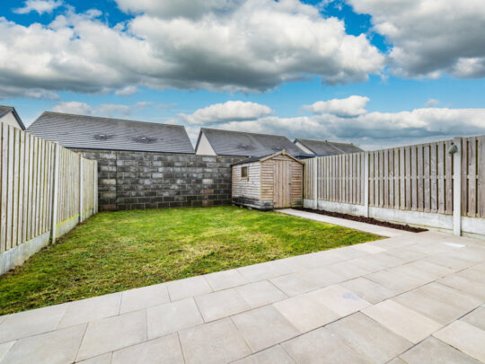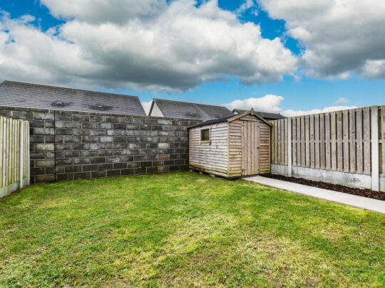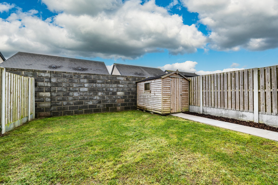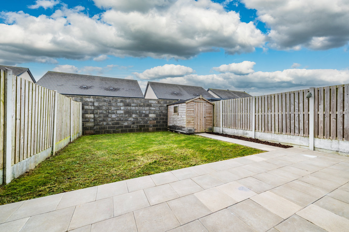 Superb fully enclosed south facing private rear garden with extensive paved patio and gravelled & there is a concrete pathway to side of house), outside tap lighting, garden shed. Rear garden measure