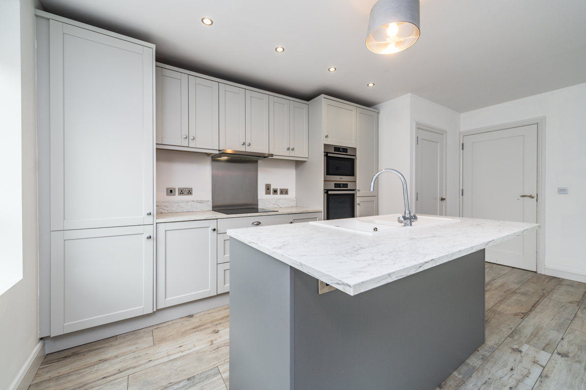 Kitchen / breakfast room: smart wood effect tiled flooring, fully fitted kitchen with a range of high & low cabinets, worktops with upstand, undercounter inset sink, integrated Zanussi dishwasher, Zanussi oven, Zanussi ring glass hob, with extractor over & stainless steel splashback, feature kitchen island with breakfast bar and bin storage inset