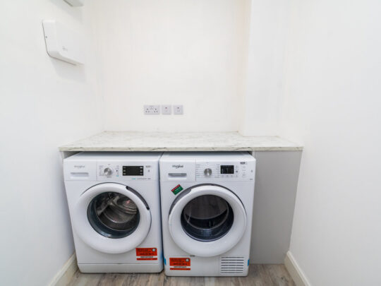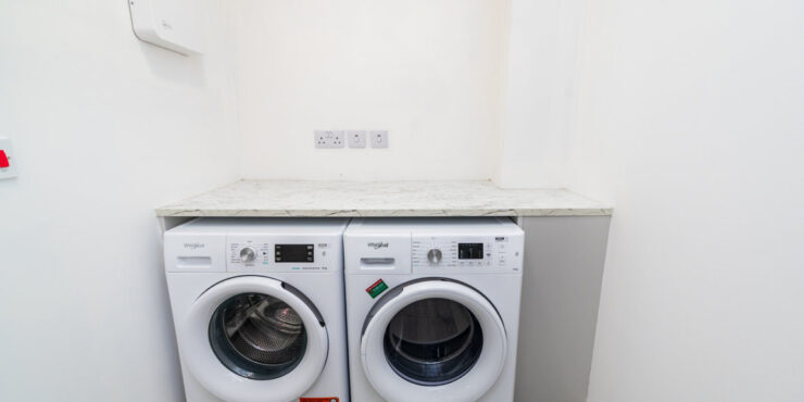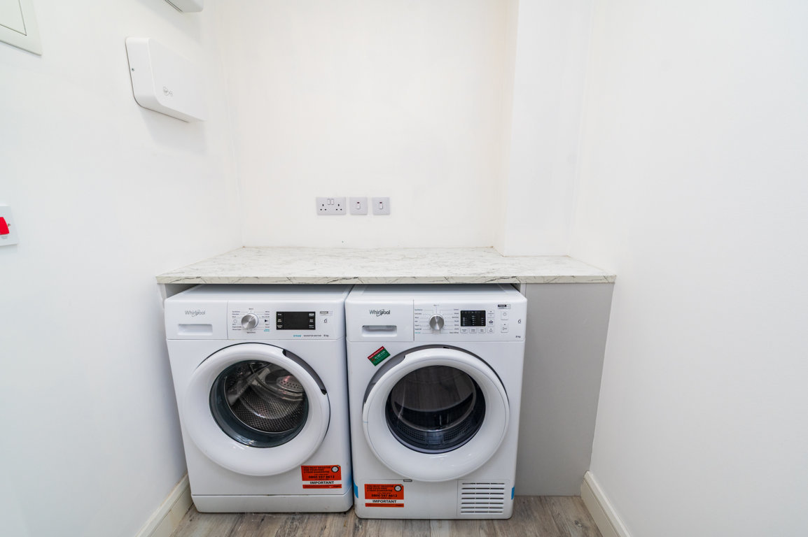 Utility Room: Whirlpool washing machine and dryer undercounter, smart wood effect tiled flooring