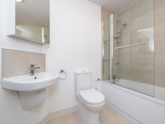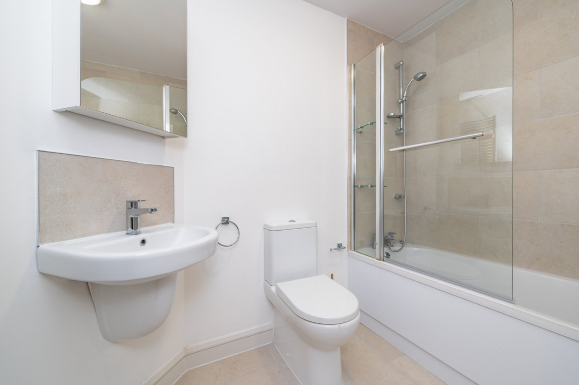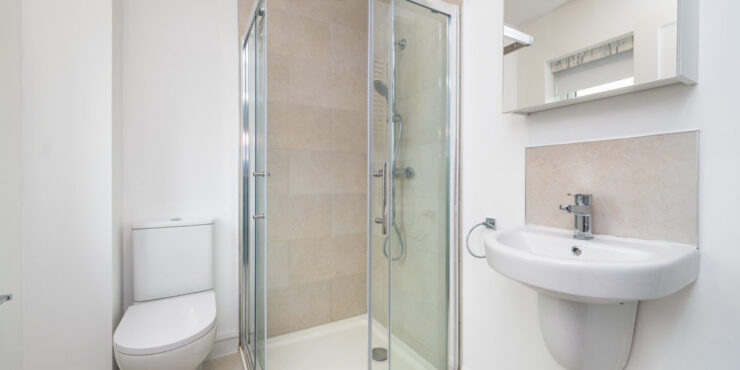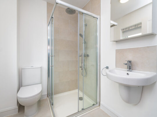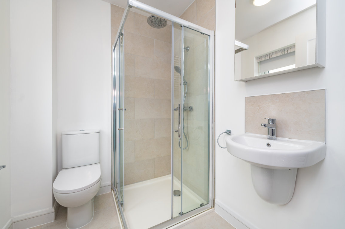En-suite: part tiled walls and tiled floor, step-in corner shower, pedestal w.h.b., w.c., wall mounted radiator and window