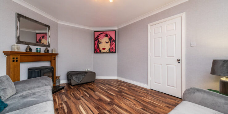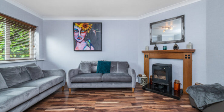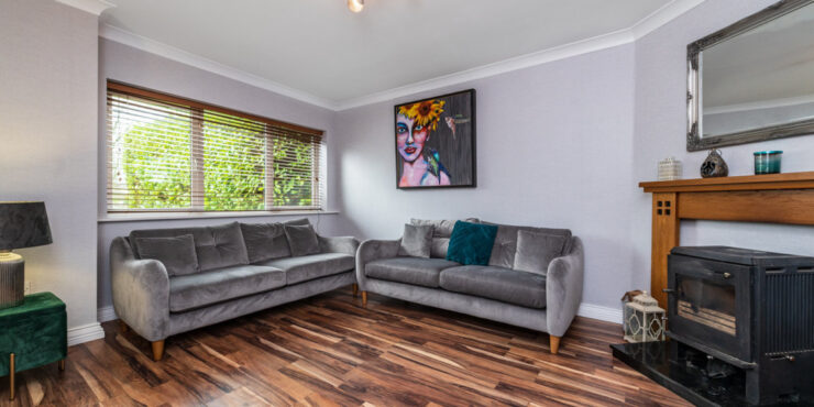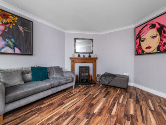 Living Room: large room to the front of the house, wood floor, tv point and internet point along with a feature fireplace with a multi fuel burning stove.