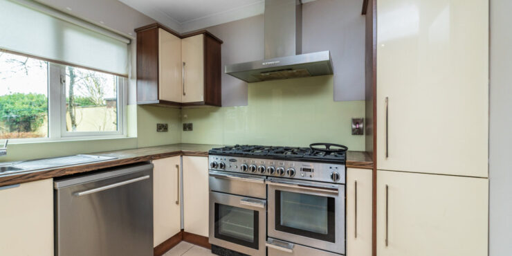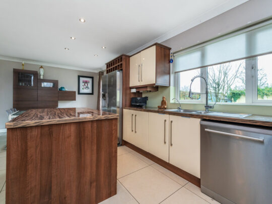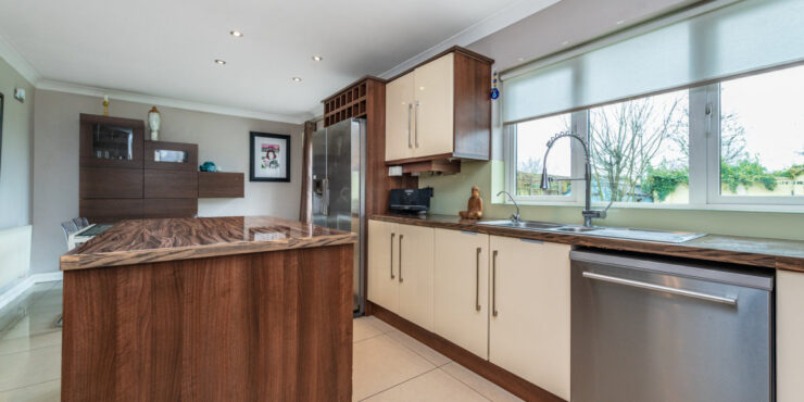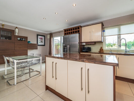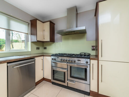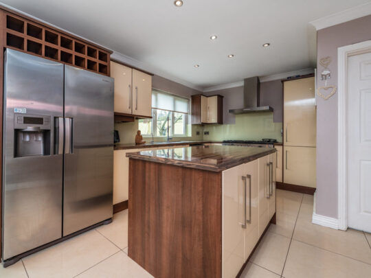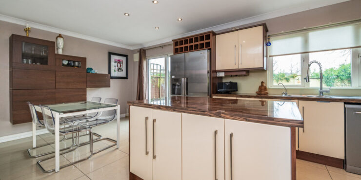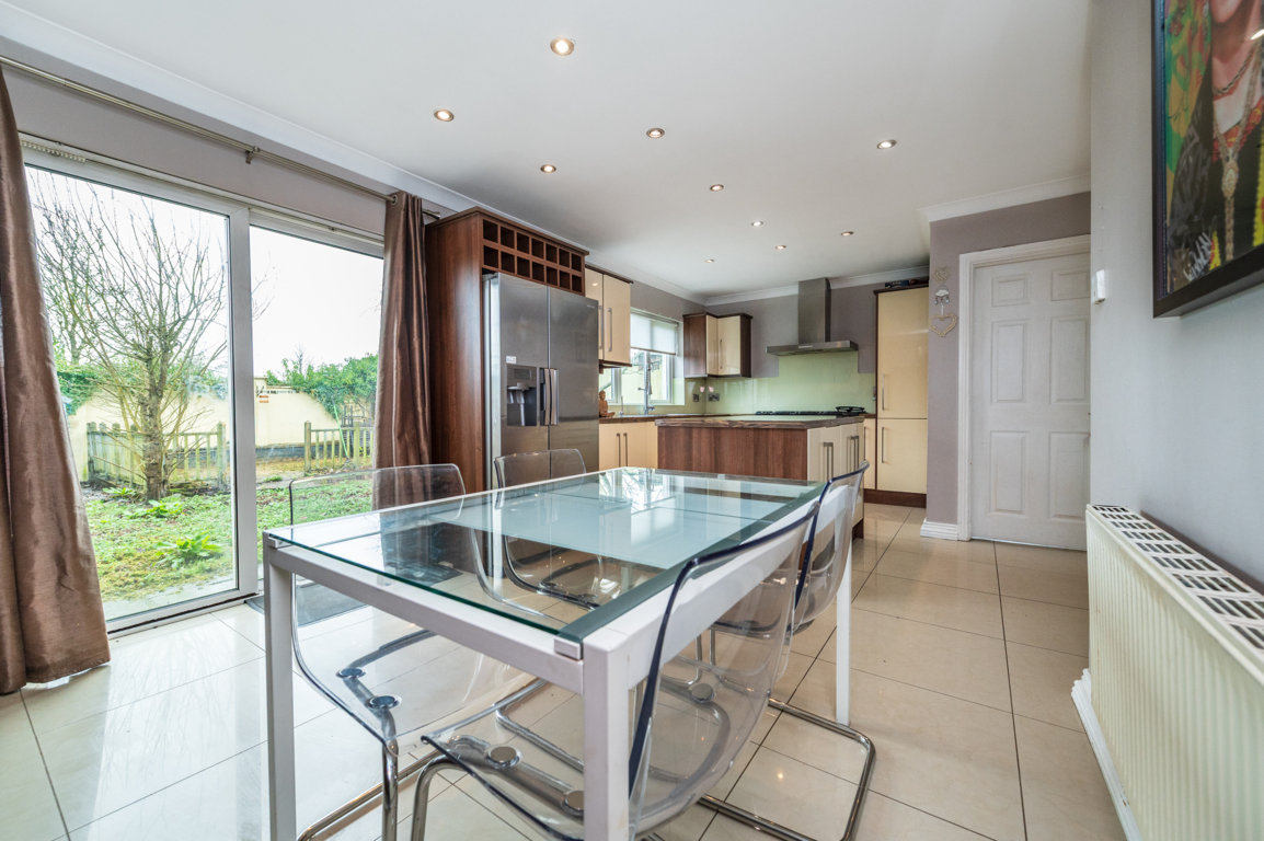 Kitchen/Dining Area superb kitchen in immaculate condition with porcelain tile floor. Feature gas rangemaster included with chimney hood extractor fan. Kenwood dishwasher and Samsung American Fridge Freezer included. Island unit with large countertop and ample storage underneath along with pull out storage presses. Built in water softener in kitchen. Built in wine rack in kitchen. Sliding patio door to rear garden.