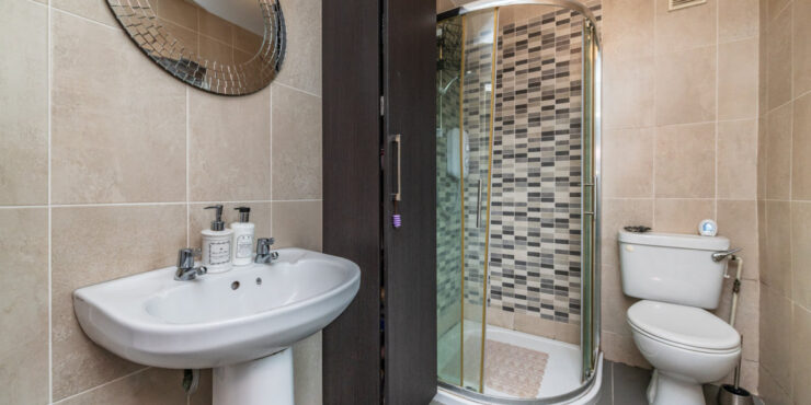 En-suite with Mira electric shower, wc and whb, overhead light over vanity unit with built in storage.