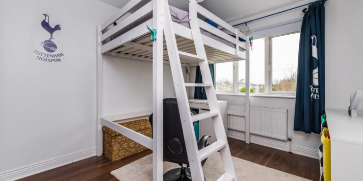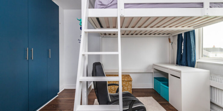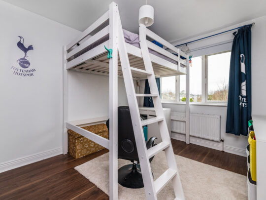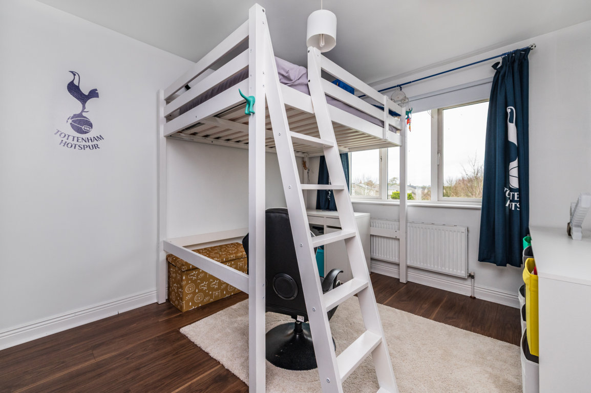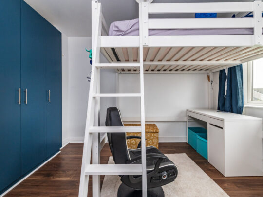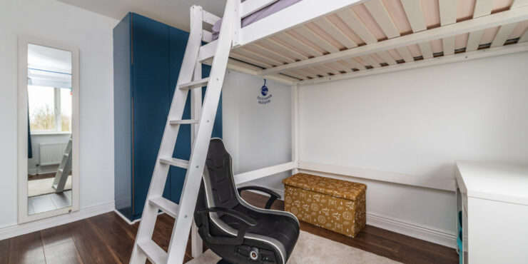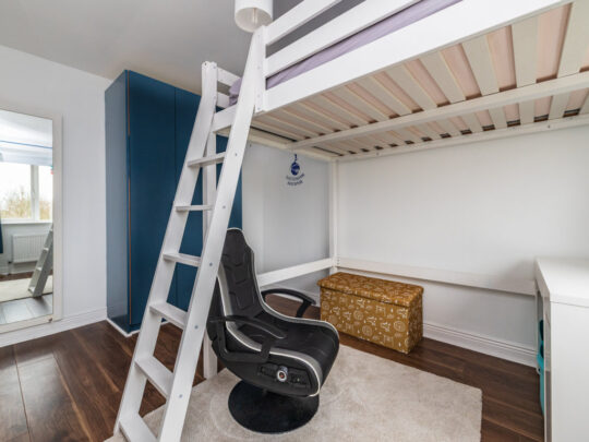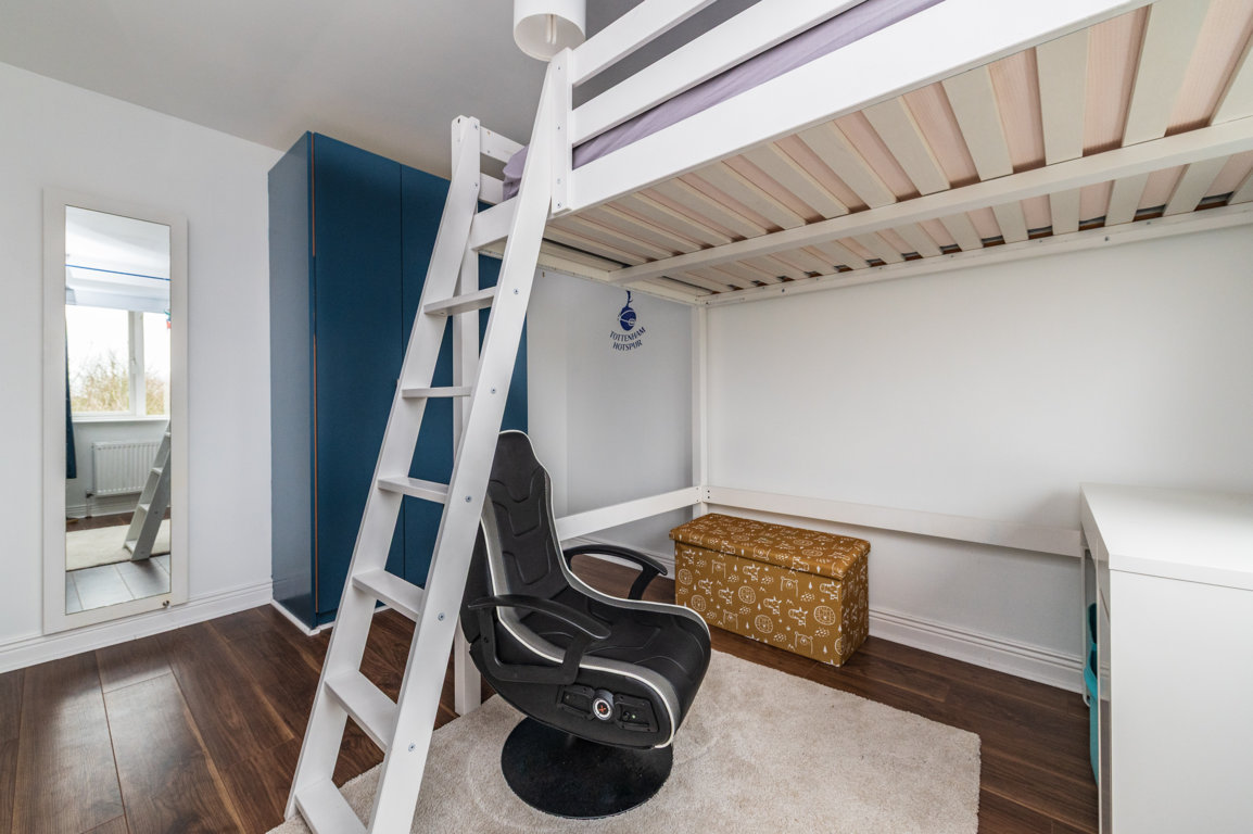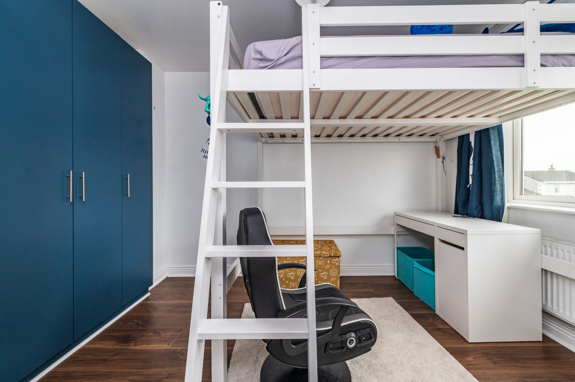 Bedroom 2: built in wardrobes and built in bunk bed with desk area underneath. Wooden floor.